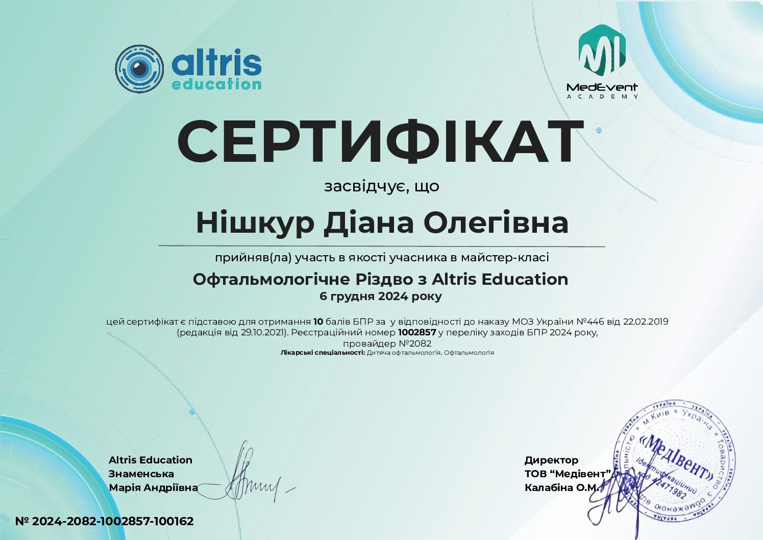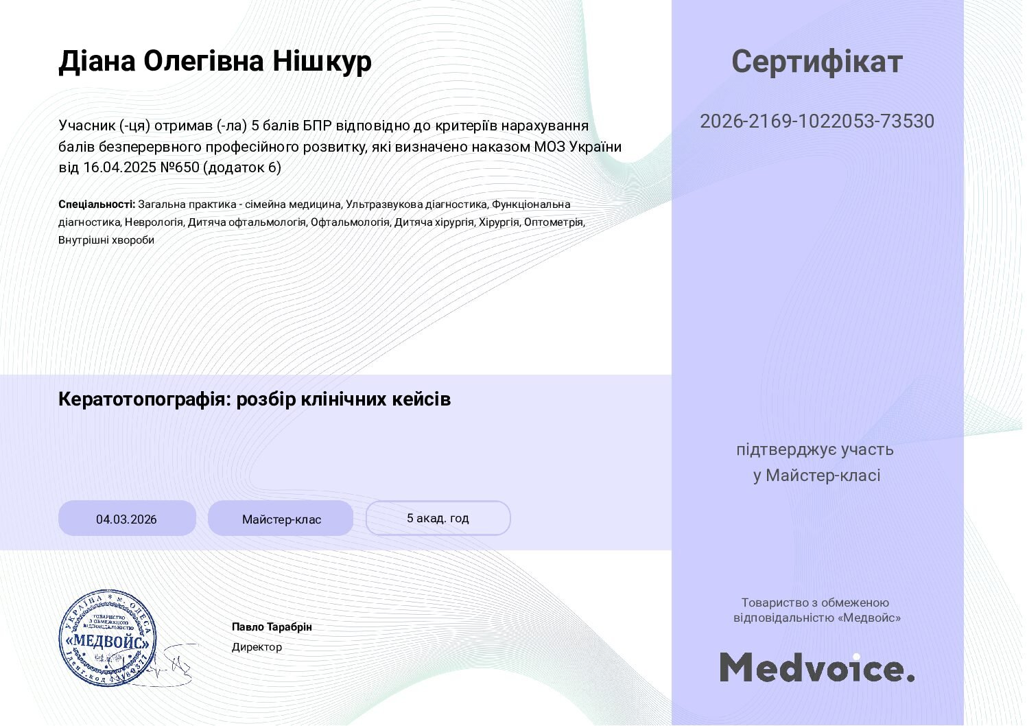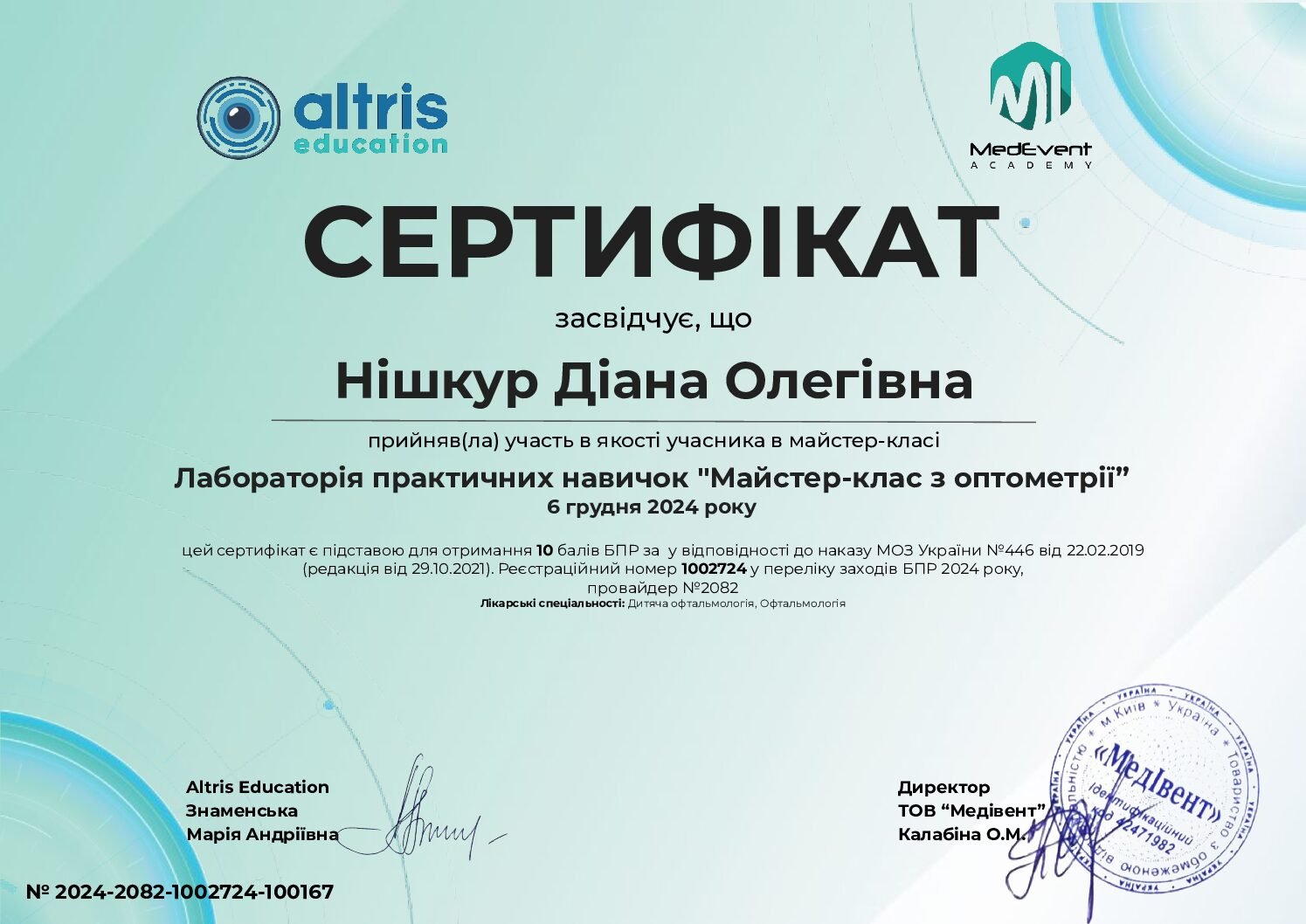 - 2024 г. — мастер-класс «Гониоскопия и периметрия», Киев