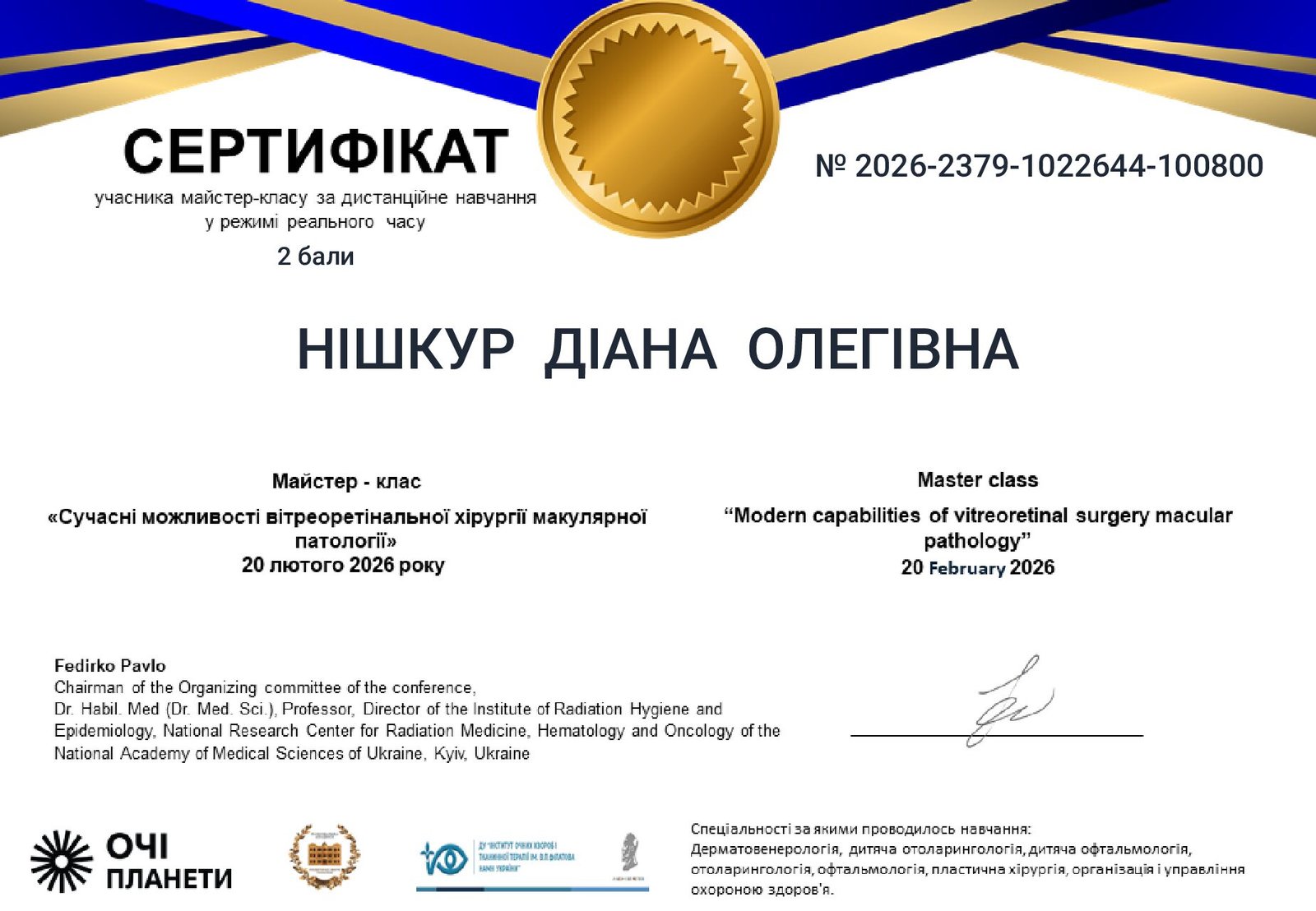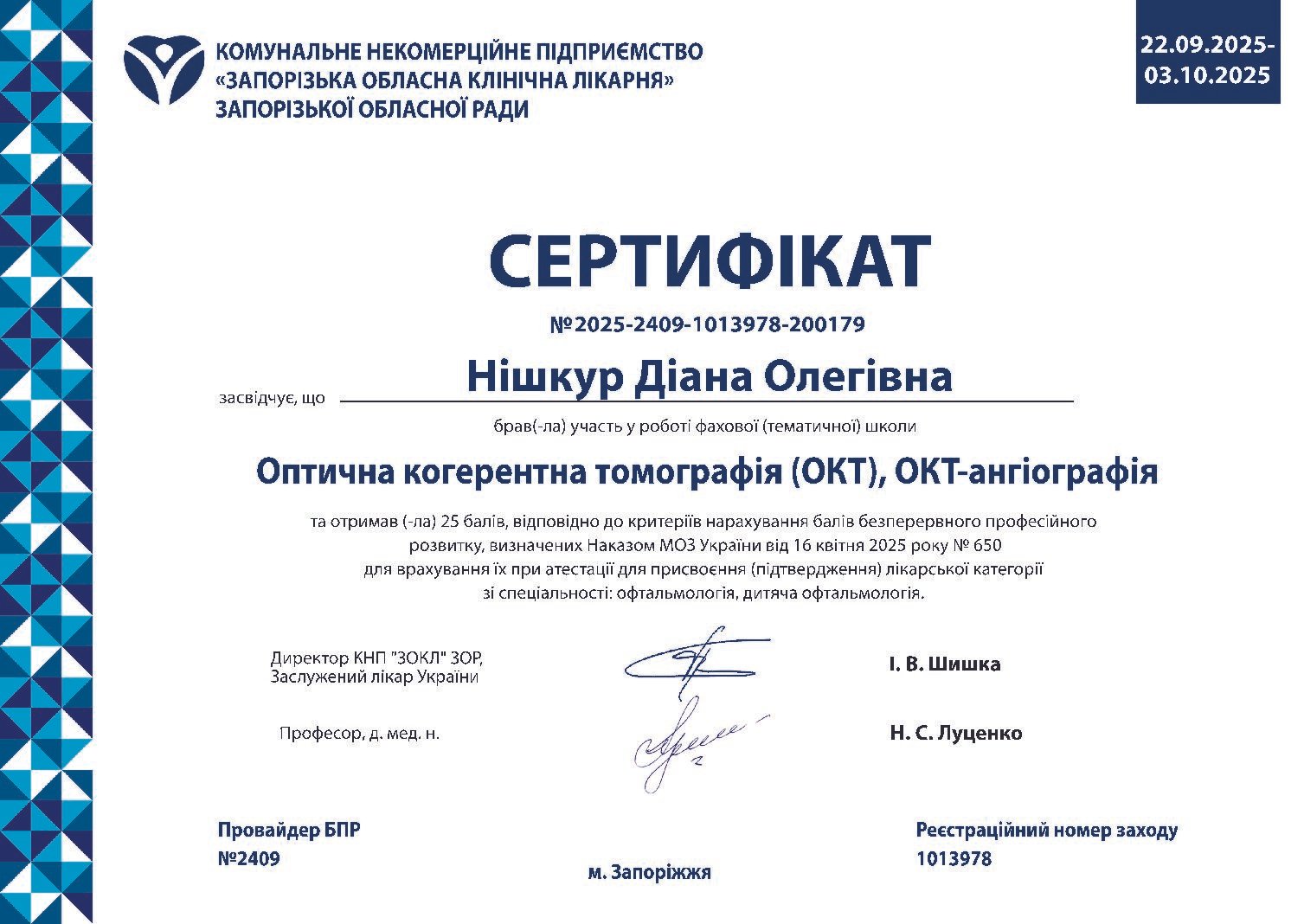 - 2025 г. — оптическая когерентная томография (ОКТ, ОКТ-ангиография), Запорожье