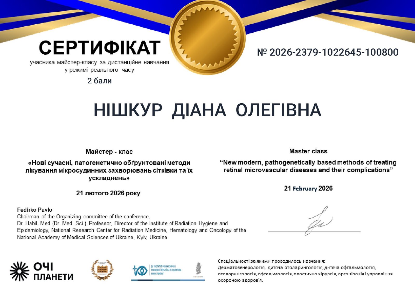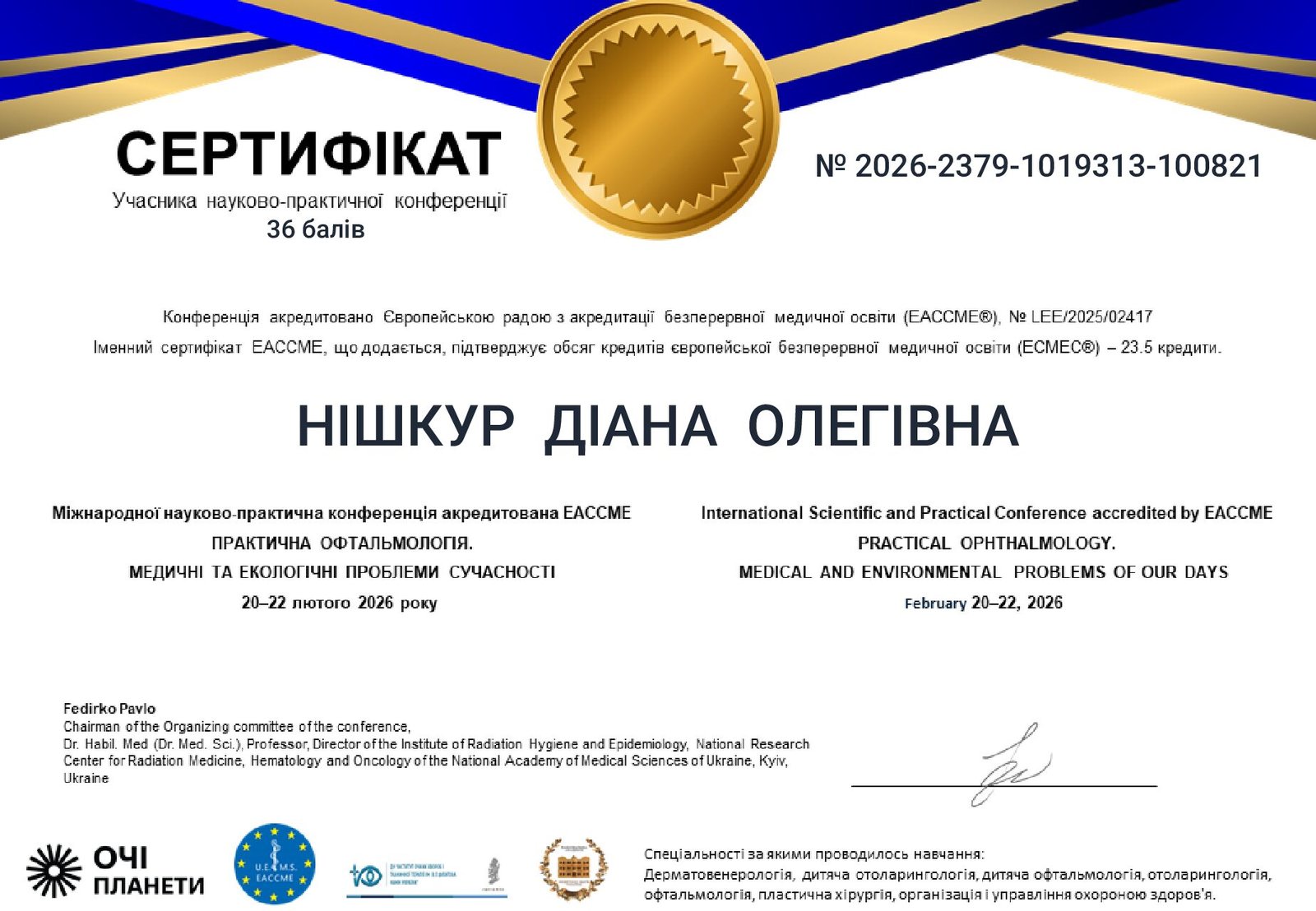 - 2026 г. — международная конференция «Практическая офтальмология» (EACCME), Киев